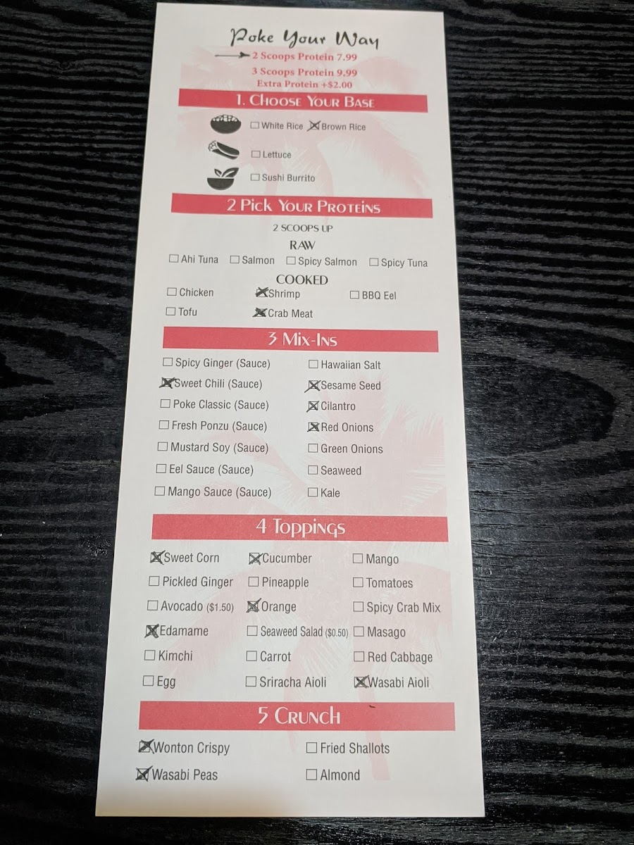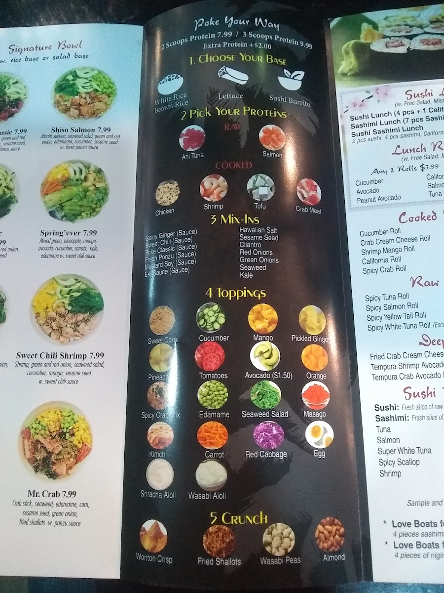 Tuna salmon white fish avocado inside top with chef special sauce.
